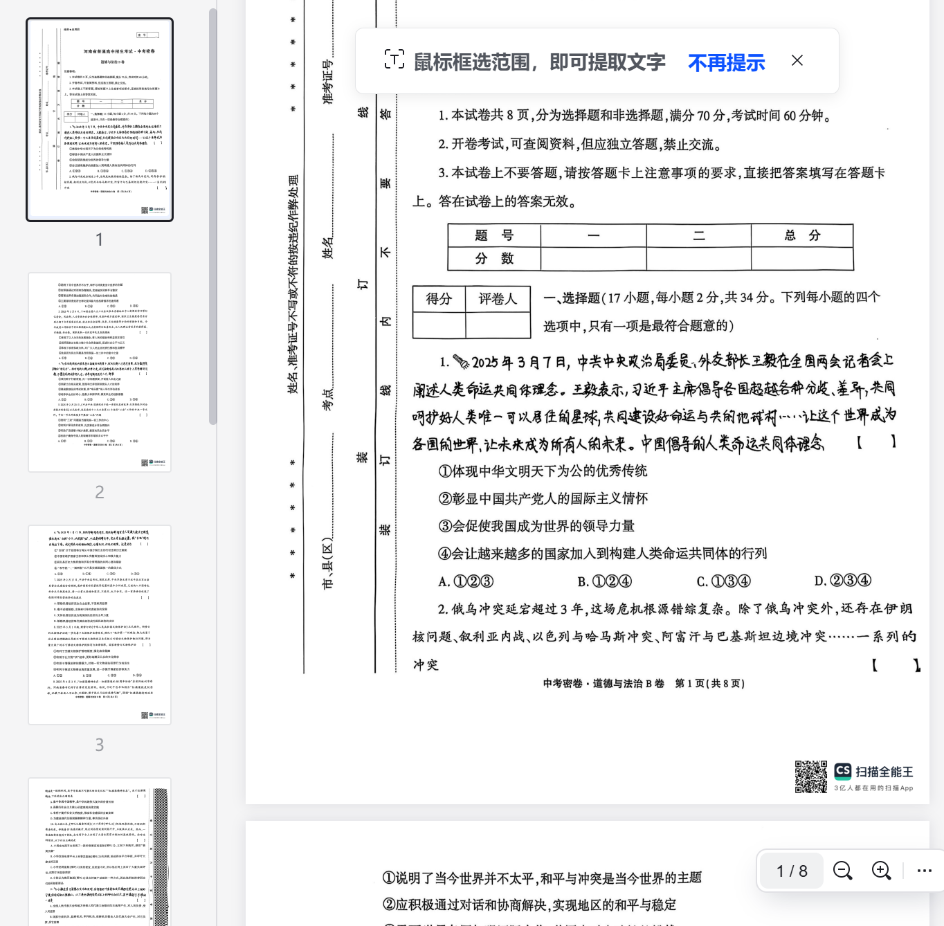 中考密卷·道德与法治B卷 第1页(共8页)
